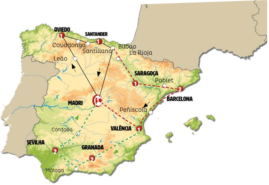 Madrid, León, Oviedo, Covadonga, Santilhana, Santander, Bilbao, Area de Serviço Foronda, La Rioja, Zaragoza, Poblet, Barcelona, peniscola, Valência, Alicante, Caravaca de La Cruz, Granada, Málaga, Marbela, Ronda, Sevilha, Córdoba, consuegra.